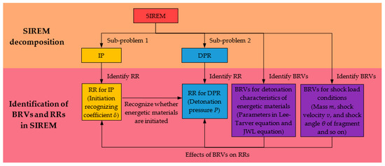 The macroscopic SIREM study should explore in turn the R’s of energetic materials and the randomness of P after energetic materials are initiated, so it is natural to decompose SIREM into IP and DPR. The main BRVs on the detonation characteristics of energetic materials can be selected from the parameters a, I, b, x, G1, c, d, y, G2, e, g, and z in the Lee–Tarver equation of reaction rate and the parameters Ac, Bc, Rc1, Rc2, wc, Ag, Bg, Rg1, Rg2, and wg in the JWL equation of state. The main BRVs on shock load conditions can be selected from the physical quantities, such as the mass m, shock velocity v, and shock angle θ of a fragment. In IP, δ should be introduced as RR. In DPR, the P of energetic materials should be defined as RR.