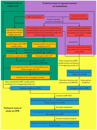 Firstly, new BRV sample points are generated, which conform to the corresponding statistical distribution and whose sampling ranges and densities meet statistical needs, and these BRV sample points are standardized, so as to construct the prediction sample sets of IP. Then, all the standardized BRV sample points of the prediction sample sets of IP, as input data, are inputted in turn into the surrogate model (GABPNN) of IP, so as to quickly calculate the 0–1 recognition results of δ corresponding to these sample points. Then, these 0–1 recognition results of δ are statistically analyzed, so as to obtain the estimates of the R’s of energetic materials, thus solving IP.