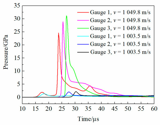 The pressure curves of the three gauges of the numerical model when the v’s are 1003.5 m/s and 1049.8 m/s, respectively.