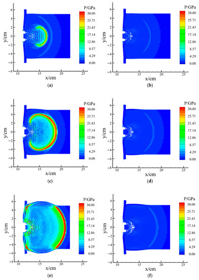 The color contour plots of the pressure when the v’s are 1003.5 m/s and 1049.8 m/s, respectively. (a) The contour plot when t = 22 μs, v = 1049.8 m/s. (b) The contour plot when t = 22 μs, v = 1003.5 m/s. (c) The contour plot when t = 25 μs, v = 1049.8 m/s. (d) The contour plot when t = 25 μs, v = 1003.5 m/s. (e) The contour plot when t = 28 μs, v = 1049.8 m/s. (f) The contour plot when t = 28 μs, v = 1003.5 m/s.