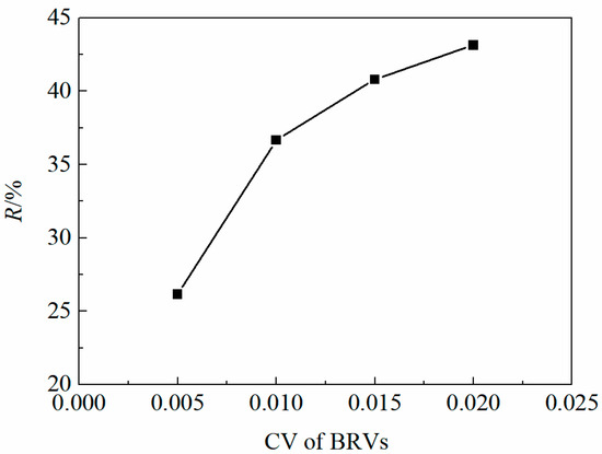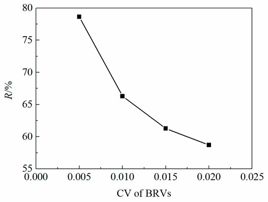 According to the statistical data in Table 11 and the correlation curve in Figure 11, it can be concluded that, when the is 1000 m/s, the R of Composition B is positively correlated with the CV of the BRVs; that is, the smaller the CV of the BRVs, the lower the R of Composition B. This is because the smaller the CV of the BRVs, the more concentrated the distribution of the BRV sample points in the corresponding prediction sample sets, the less BRV sample points there are that can lead Composition B to be initiated, and the lower the randomness of the SIREM. If the CV of the BRVs dropped to 0, this SIREM would become a deterministic problem, so Composition B would not be initiated (the R would drop to 0) under the shock load condition where was 1000 m/s, which would be exactly the same as the deterministic results described in Section 4.1.