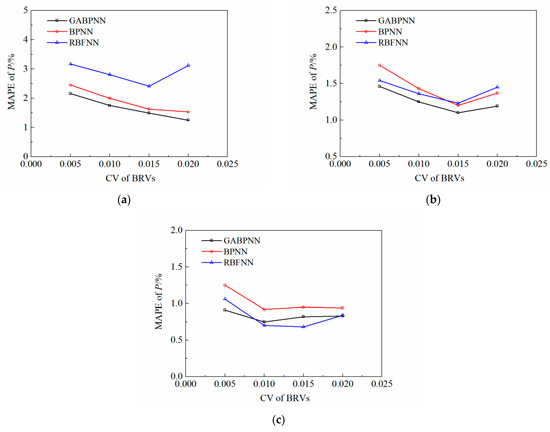 The comparisons of the MAPEs that the ANNs calculate the P’s of the three gauges in the numerical mode in the DPR study under the shock load condition where is 1000 m/s. (a) Gauge 1. (b) Gauge 2. (c) Gauge 3.