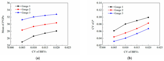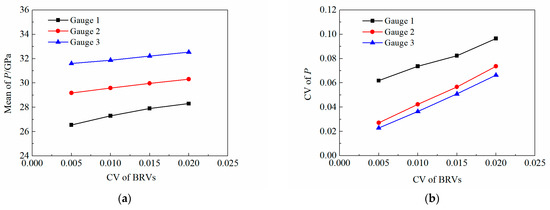 The correlation curves between the statistical characteristics of the P and the CVs of the BRVs under the shock load condition where is 1000 m/s. (a) The correlation curves between the means of the P and the CVs of the BRVs. (b) The correlation curves between the CVs of the P and the CVs of the BRVs.