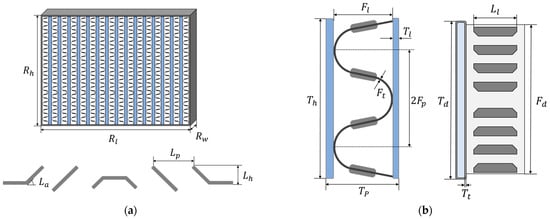 Three-dimensional modeling of heat exchanger: (a) sketch and parameters at fin front view; (b) sketch and parameters at plane view.