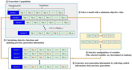 (5) Replace: When a model with a lower objective function value compared to the optimal model of the previous generation is observed among the models of the next generation population, the value of the current generation evaluated as the objective function is selected from the variable information of the previous generation.