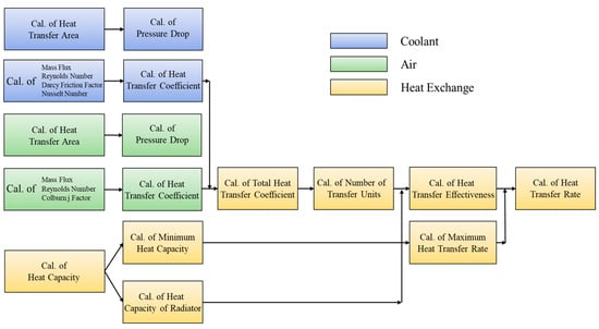 The LFHX is one of the heat exchangers in charge of heat exchange in the cooling system and is a thermal management component that cools the temperature of the coolant through heat exchange with outside air to control the vehicle temperature. The LFHX must be used by selecting the type of heat exchanger that is designed to meet the heat transfer requirements within the constraints. It was intended to measure the outlet temperature utilizing the coolant, air flow rate, and inlet temperature as parameters based on the heat exchange theory, the effectiveness-NTU method, in order to correctly understand the heat exchange characteristics. When the type and dimensions of the heat exchanger are specified, the effectiveness-NTU method calculates the heat transfer and outlet temperature for a particular mass flow rate and inlet temperature. In other words, it is used when the heat transfer area is known and the outlet temperature needs to be derived, and the heat transfer performance of a specified heat exchanger needs to be determined, or whether the heat exchanger can work. Effectiveness is defined as the ratio of the actual heat transfer rate/maximum possible heat transfer rate and is based on a dimensionless coefficient called heat transfer effectiveness. The heat exchange characteristics of the LFHX can be determined by calculating the effectiveness ‘ε’ based on the flow rate and temperature of the cooling water and outside air. Figure 3 is a flowchart of the procedure for obtaining the heat transfer rate, which is one of the performance indicators of the heat exchanger, and the heat transfer rate is finally obtained using the effectiveness-NTU method. In this study, the temperature of the cooling water is determined according to the temperature of the outside air by using the effectiveness-NTU method based on the geometry of the louver fin, and the pressure is calculated by taking into account the pressure drop and head loss in the LFHX inner tube.