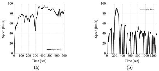As shown in Figure 6a, the HWFET travels 16.45 km at an average speed of 77.7 km/h for 765 s and is used to express high-speed driving conditions. It was used to confirm the characteristics of the cooling system under continuous vehicle load conditions. As shown in Figure 6b, UDDS travels 12 km at an average speed of 32 km/h for 1369 s and is used to depict city driving conditions. It was used to test actual vehicle characteristics in urban driving conditions; deceleration, stop, and acceleration are frequent performances according to traffic conditions in an urban environment.