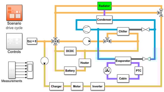 Figure 7 shows an integrated thermal management system model for electric battery vehicles. The purpose of this model is to derive the heat value of the powertrain unit according to vehicle driving conditions and state, and to cool it to properly maintain the operating temperature of each unit, while satisfying the cabin heating and cooling performance desired by the passenger. The orange line flow path, which uses a 50:50 mixture of water and ethylene glycol as the working fluid, operates in two methods, series and parallel, via the four-way valve. If operating in series, the four-way valves are connected according to A–D and B–C. In this case, the radiator is responsible for cooling the charger, motor, and inverter, and the battery and DC–DC converter are handled by the chiller. When the operation is performed in the parallel manner, the operation is connected according to A–B and C–D. In this case, the cooling of all powertrain units is performed through an integrated cooling flow path.