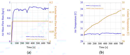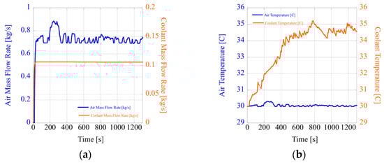 Inlet boundary condition in HWFET: (a) mass flow rate in air side and coolant side; (b) temperature in air side and coolant side.