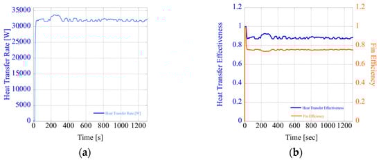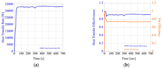 Optimal design heat exchanger results at UDDS drive cycle: (a) heat transfer rate; (b) heat exchanger effectiveness and fin efficiency.