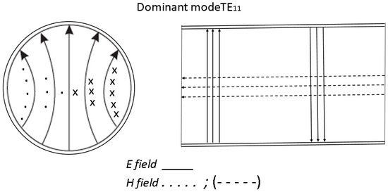 Lines E and H of the dominant mode (TE11) of waveguides with a circular cross-section.