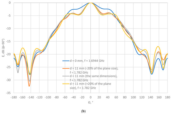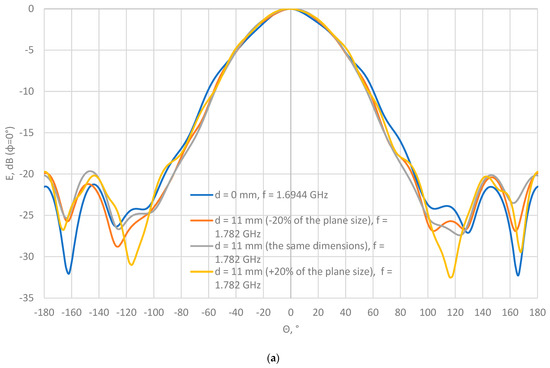 If we compare the radiation patterns of the aperture antenna with and without the dielectric plate (d = 0 and d = 11 mm for the same dimension of the dielectric material and the plane in Figure 11) with the previously defined best values of the dielectric plate parameters (i.e., the thickness d = 11 mm, εr = 2.5, µr = 1, σ = 0 S/m, tg δ = 0.09, tg δμ = 0, h1 × h2 = 423 × 450 mm2, ρ = 1200 kg·m−3), it can be concluded that there are some changes in the radiation diagram. The largest deviations of −2.5 dB at ±25° (side lobes) and +5.0 dB at 158° (back lobe) can be seen in the H plane and +9.0 dB at 165° (back lobes) in the E plane, whereas deviations are negligible in the rest of the range of angles in both planes (E and H planes).