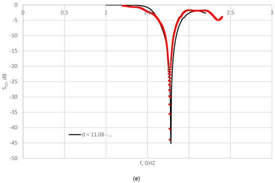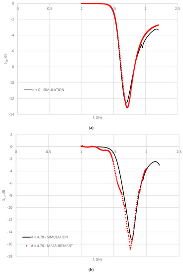The measurement was possible for a larger number of dielectric thicknesses, and it was found that for the given aperture antenna, a dielectric plate thickness of 11.08 mm gives the minimum value of the reflection coefficient S11 of −43.93 dB at the frequency of 1.7550 GHz. The minimum reflection coefficient obtained by additional simulation for d = 11.08 mm is −45.17 dB at the frequency of 1.7820 GHz. Apart from d, which is variable, other parameters are set within the limits given in [17,20].