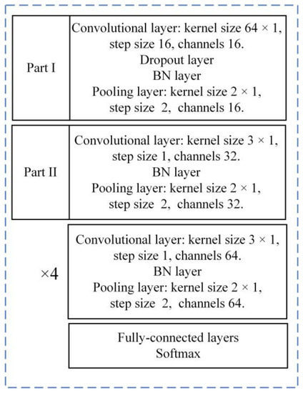 With the development of artificial intelligence technology [18], deep learning theory has been widely applied in signal classification, intelligent fault diagnosis, image recognition, analog data generation, target detection and other fields [19,20,21,22,23,24]; and a variety of neural networks have been derived. In these neural networks, the one-dimensional convolutional neural network (1DCNN) [25], VGG-Net [26], AlexNet [27], ZFNet [28] and other neural networks have been used by many researchers for mechanical damage diagnosis by transforming dimensions and changing depth and convolution kernel size. However, long short-term memory [29], recurrent neural networks [30] and faster convolutional neural networks [31] have been improved by many scholars by changing the number of feature extraction layers and using the residual neural network, so as to improve the feature extraction capability of the neural network—and have then been applied to real-time detection in the fields of mechanical vibration and unmanned aerial vehicle vision.