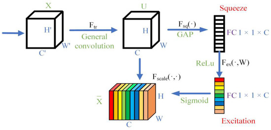 The characteristic of the SENet module is that it focuses on the relationships between channels in the hope that the model can automatically learn the importance of different channel features. After multi-layer neural network training with the data, the number of channels will naturally increase and the weight of different channels will be unequal. The SE module is an integral part of the SENet module. After using the SE module, more important weight information could be captured so that the model could obtain higher amounts of information, resulting in the accuracy naturally improving. The structure of the SE module is shown in Figure 2. It can be seen from Figure 2 that the SE module is divided into squeeze and excitation. In the squeeze part, the input feature vectors are compressed into 1 × 1 × C vectors through global averaging pooling. The primary function proposed by global averaging pooling is to replace part of the fully-connected (FC) layer, reduce the number of parameters of the fully-connected layer and regularize the whole network structure to prevent overfitting. The purpose of using global average pooling in the squeeze part is also to reduce the dimensions of the data. The compressed feature vector enters the fully-connected layer after passing the ReLu activation function. The FC layer in the first part is to reduce the amount of computation, and the data size at this part is 1 × 1 × C/r. The FC layer in the second part is to restore the data dimension to 1 × 1 × C. In the excitation part, the FC layer is restored to the original input dimension size after being stacked by the Sigmoid function and then added to the original input to get the output result.