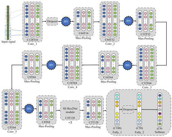 Because the accuracy of damage diagnosis of frame structures using TICNN is relatively low, this paper modified various parameters of TICNN including increased depth of the neural network and improved feature extraction ability of the model. On this basis, the SE-Res2Net module was added to form the proposed new model to obtain higher accuracy and strong anti-noise ability. The overall structure of the proposed new model is shown in Figure 5. As can be seen from Figure 5, compared with TICCN, the new model proposed in this paper reduces the step size of the first convolutional layer, increases the step size and the convolution kernel size of the second convolutional layer, reduces one set of convolution layer and pooling layer, and adds five layers of the SE-Res2Net module. In addition, a Dropout layer was added at the fully-connected layer.