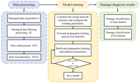 The schematic diagram of the damage diagnosis process of the frame structure is shown in Figure 6. It can be seen from Figure 6 that the whole damage diagnosis process includes data processing, model training and damage diagnosis results.