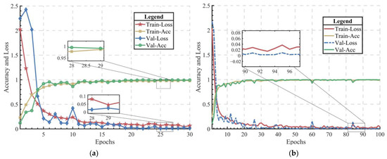 In the process of model training, Adam was used as the optimizer and the initial learning rate was set to 0.001. The training curves of the nine damage cases of the frame structure are shown in Figure 8. In order to show the training results more clearly, the curves of training epoch = 30 and training epoch = 100 were drawn, respectively. It can be seen from the figures that when the training epoch reaches 4, the training results begin to converge, the accuracy gradually rises to more than 90% and the loss begins to be less than 0.1. When the training epoch reaches 30, the loss of the training and the validation dataset reach about 0.02, and the accuracy is also higher than 98%. When the training epoch reaches 100, the loss curves tend to be gentle and fluctuate at epochs = 25, 60 and 85, respectively. The final loss is about 0.009, which shows that the proposed new model can achieve higher classification accuracy.