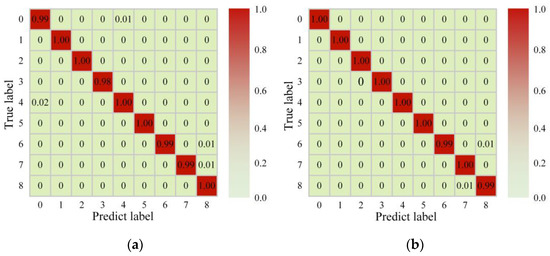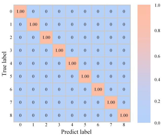 The test process needs to save the trained model first, and then input the test dataset into the saved model to obtain the diagnosis results. The confusion matrix displays the diagnosis results of the test dataset, as seen in Figure 11. It can be seen from the data in Figure 11 that the data in other positions are zero—except the data on the diagonal line is 1.0—so it is easy to calculate the accuracy and recall based on the data in the figure. According to the data calculations of the confusion matrix in Figure 11, the accuracy of the test dataset reached 100% and the recall was also 100%. This shows that the proposed new model has an ideal requirement for the classification ability of damage types.