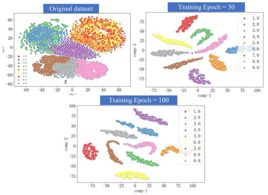 In this section, the original data, the result of training epoch = 30 and the result of training epoch = 100 were visually analyzed. The results are shown in Figure 10. From the figure, it can be seen that the original dataset of nine damage cases is very confusing. After 30 epochs training, in addition to sporadic dispersion at the edge of damage case 8 and case 9, the other damage cases can be clearly distinguished. After 100 epochs training, nine damage cases can be completely and clearly distinguished, and the effect is ideal.