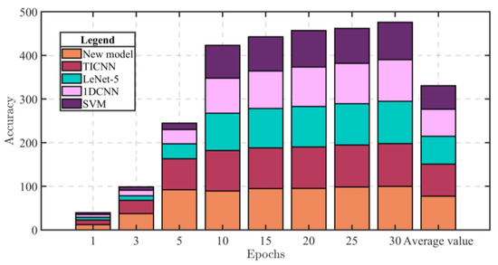 - Compared with other similar models, the proposed new model has the highest accuracy of 99.6% when the training epoch reaches 30, and the average value of accuracy can reach 77.3%, which is higher than other models. Therefore, the proposed new model can achieve higher accuracy in the early stage of training and has better performance than other models.