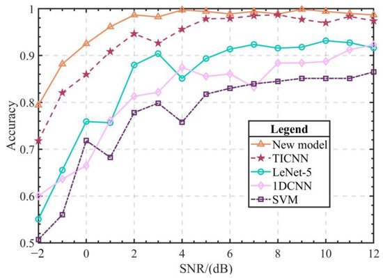 The comparative experiment of anti-noise ability also used the above models. Firstly, the Gaussian white noise with different signal-to-noise ratio (SNR: −2~12 dB) was added to the original signal. Then the data after added noise were used as the input of the above models to obtain the diagnosis results. Finally, the accuracy of the five models was compared. The results are shown in Figure 14. The figure shows that the new model has excellent advantages in accuracy and stability compared with the shallow SVM model and LeNet-5 model. The new model performs well under different SNRs. The accuracy of the new model is about 80% when the SNR is −2 dB, while that of TICNN is 72% and that of 1DCNN is 60%. The diagnostic results of both are lower than that of the new model, so it can be concluded that the new model proposed in this paper is more reliable under the condition of strong noise for damage diagnosis of frame structures.