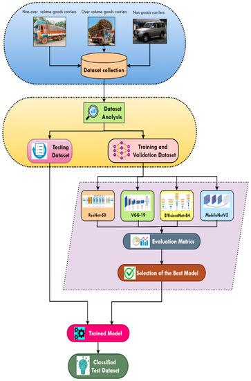 The research was performed on a public dataset called ‘Poribohon-BD’ [17], which consists of a total of 8138 Bangladeshi common vehicle images categorized into 15 types. In [18], the authors collected a new dataset of 10,000 images extracted from road surveillance and driving videos. The dataset is categorized into six classes including rickshaw, motorbike, truck, van, bus, and car. The ResNet architecture gave the best performance with an accuracy of 95.14%. It can be seen that many solutions have been introduced as discussed to classify and identify overloaded vehicles in [7,8,9,10,11,12,13,14,15,16,17]. The authors of [18] showcase great performance when classifying real-time data that consist of different types of vehicles, and this provides us with the motivation to classify over-volume vehicles using deep CNN models. In this respect, few studies have been carried out exhibiting the solution to this problem in the past. The major aim of this work is to develop a realistic new dataset with different categories and to implement the datasets in various state-of-the-art CNN models for classification based on a transfer learning approach and fine-tuning.