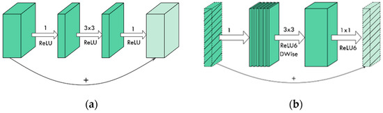 In (a), the residual is used to connect the layers with a high number of channels, whereas in (b) the bottlenecks are connected by inverted residuals [29].