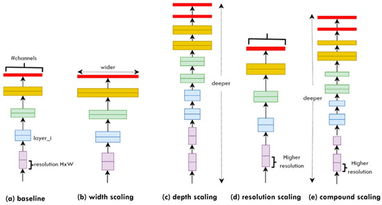 Comparison of different scaling methodologies (a–e). In contrast to conventional scaling methods (b–d), which arbitrarily scale a single dimension of the network, the compound scaling method uniformly scales up all dimensions in a principled way [32].