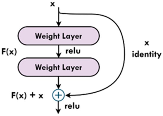 A residual network (ResNet) was the winner of the ImageNet challenge in 2015. The reason behind its fine performance was the introduction of ‘skip connections’ in its architecture [33]. In the back propagation phase, the deep neural networks encounter a problem of vanishing gradients as the gradients near the inputs are obtained by multiplying the gradient of later layers, which is a major concern in depth-scaled deep neural networks. This affects the convergence of the model. To address this problem, ResNet architecture is introduced, which consists of convolutional and identity blocks with skip connections built into it. In the backpropagation phase, these connections help to skip certain layers, which helps reduce the effect of the vanishing gradient problem. Figure 5 gives a visual overview of the skip connections. The final dense layer of this architecture was modified to fit three classes with the help of the Softmax activation function and trained from scratch with our dataset.
