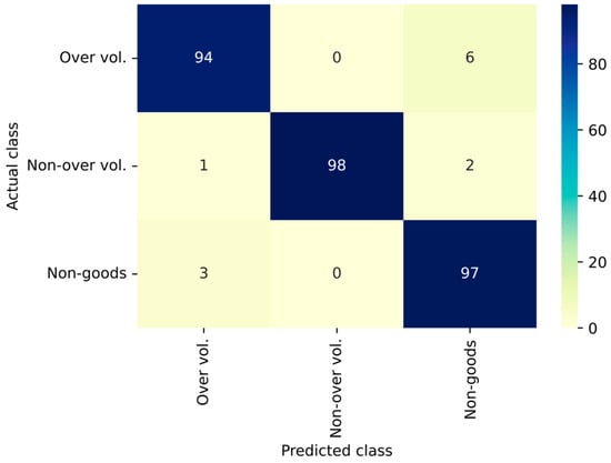 The 3 × 3 confusion matrix for the best model (EfficientNetB4) is presented in Figure 7 with three rows and columns related to three different classes of vehicles. The rows represent the actual labels and columns represent the predicted labels. From the confusion matrix, it is understood that that the EfficientNetB4 model shows better performance in terms of handling non-over-volume goods carriers and non-goods carriers compared to over-volume goods carriers.