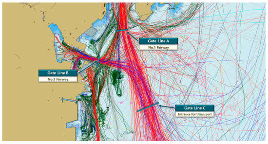 The target sea area was limited to Ulsan Port, the largest industrial support port in Korea; there are several fairways including the entrance for Ulsan Port. Among those, the most complicated gate line of No.1 Fairway was selected as the analysis point, which is near the gate line of No.3 Fairway and the entrance for Ulsan Port. The period of the data is from 1 September 2019 to 31 August 2020. Figure 2 is an example of the visualization of the AIS data of the target sea area.