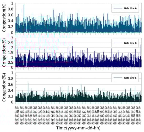 The annual average was found to be 30.2% and the maximum value was 230.9% when the maritime traffic congestion of gate line B (No. 3 fairway)—a major gate line around the target gate line—was analyzed. The monthly average was the lowest in September (28.3%) and the highest in March (33.2%). The annual average was found to be 6.7% and the maximum value was 65.3% when the maritime traffic congestion of gate line C (entrance to Ulsan Port) was analyzed. The monthly average was the lowest in June (5.5%) and the highest in March (8.1%). Figure 3 and Figure 4 show the hourly and monthly maritime traffic congestion analysis results by each gate line.