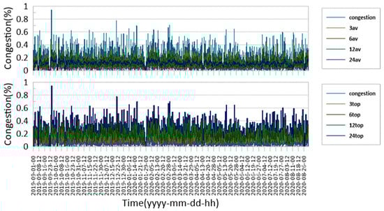 In addition, considering the characteristics of maritime traffic congestion, the average and maximum values for 3, 6, 12, and 24 days were selected as the features. Figure 5 illustrates the results of analyzing the average, maximum, and minimum maritime traffic congestion for 3, 6, 12, and 24 days.