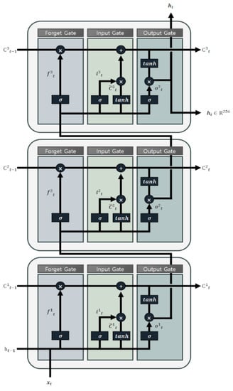 The training model was designed using LSTM considering that maritime traffic data are time-series data. Although LSTM has the drawbacks of requiring a long training time, consuming a large amount of memory, and being vulnerable to overfitting and sensitive to random weight initializations, it was chosen due to its ability to handle long-term dependencies and overcome the vanishing gradient problem commonly found in time series prediction tasks. The LSTM includes three gates: input, forget, and output; each gate determines the important information from the past and present input information via the sigmoid and hyperbolic tangent functions []. The LSTM was composed of three layers, and the hidden layer was set to 256 dimensions. The dimension of input layer changes depending on the scenario. Figure 6 illustrates the configuration of the LSTM in the developed algorithm while Table 2 summarizes the hyperparameters for training.