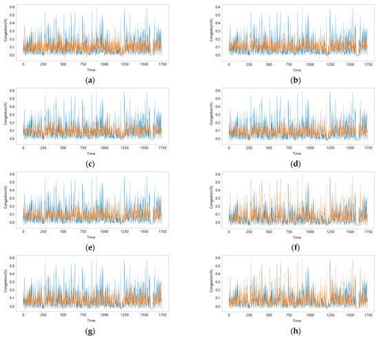 Model training results under each scenario: (a) Scenario with input data as Congestion; (b) Scenario with input data as Congestion, Variance width/rate/Prob.; (c) Scenario with input data as Congestion, 3, 6, 12, 24 avg.; (d) Scenario with input data as Congestion, 3, 6, 12, 24 max.; (e) Scenario with input data as Congestion, Num of ship, Traffic Vol.; (f) Scenario with input data as Congestion, Variance width/rate/Prob., 3, 6, 12, 24 avg., 3, 6, 12, 24 max., Num of ship, Traffic Vol.; (g) Scenario with input data as Congestion(B Gate), Congestion(C Gate); (h) Scenario with input data as Congestion, Variance width/rate/Prob., 3, 6, 12, 24 avg., 3, 6, 12, 24 max., Num of ship, Traffic Vol., Congestion(B Gate), Congestion(C Gate). The sky blue line represents actual data and orange line represents predicted data.