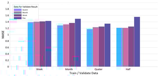 A higher performance was observed as the size of the train/validate data and test data increased and when the model trained according to the train/validate data length was validated by changing the length of the test data. The performance was guaranteed to some extent when the data for more than a week were predicted using the data of at least three months. Table 7 and Figure 8 present the model validation results based on the data for the validated result length.