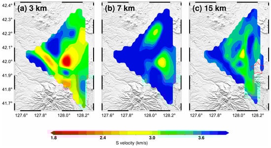 We then obtained a 3D model of the Changbai volcano using the direct inversion method []. The endpoint of the grid is 127.55/42.45. The size of each inversion grid was 0.03° × 0.03° (in longitude and latitude). “Weight” is the balancing parameter between the data fitting term and smoothness, and we set 6.5 for it. The “maxiter” is set to be 10. Figure 2 shows the ambient noise tomography results. Due to the low ray density in the depth (15 km), the area labeled as a red star in Figure 2c lacks accurate VS information.