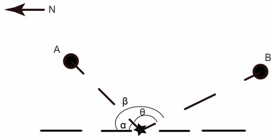 The main procedure of the application is as follows. Firstly, dispersion curves were randomly drawn among the original ones obtained by forward modeling. These dispersion curves were regarded as the results with poor ray density (or accuracy), and the rest were used as input data. Secondly, all dispersion curves were discretized into scattered points in different periods. Then, dispersion points of the same period were grouped and interpolated by kriging. In this step, two restrictions were proposed. One is the deviation angle, which is used to determine whether the data come from different areas. If the deviation angle becomes larger, the predicted point is farther from the boundary, which means that the result is available. The deviation angle is determined as shown in Figure 3. Points A and B are known, and the star indicates the predicted point. If α and β denote the minimum and maximum azimuth angles, respectively, the deviation angle is .