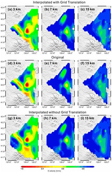 In the application of the interpolation method, different depths have different expansion multiples (Table 3). This is because different original dispersion curves have different period ranges. There are few original data in the long periods (e.g., larger than 10 s). Comparing Figure 4a–c and Figure 4d–f, the interpolation results with grid translation (Figure 4a–c) were very similar to the original results (Figure 4d–f), which provides evidence of the feasibility of dispersion curve interpolation using kriging.