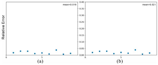Relative error of each interpolation result with different methods: (a) Relative error of the results interpolated by OK. The mean is 1.9%; and (b) Relative error of the results interpolated by UK. The mean is 2.1%.