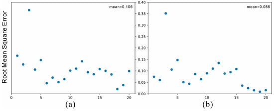 RMSE of each interpolation result with different methods: (a) RMSE of the results interpolated by OK. The mean RMSE is 0.106; and (b) RMSE of the results interpolated by UK. The mean RMSE is 0.085.