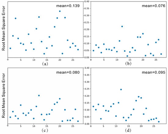 The third test is the sensitivity test about the parameters proposed in Section 3.2. The results demonstrate how the distance (search scope) influences the interpolation accuracy (Figure 7a–d). Figure 7a–d represent the RMSE of the interpolated results with search scopes of 10,000 m, 15,000 m, 20,000 m, and 30,000 m, respectively. Moreover, the mean of each RMSE is shown in the top right-hand corner. The larger the search scope, the higher the time cost; however, it is not necessary to obtain more accurate results. According to Table A2, “angle” hardly affects the accuracy of the interpolation, because “angle” is proposed to limit the range of interpolation, and “distance” mainly determines the amount of data participating in the interpolation. There is no real data to be compared with the predicted outside the array. If not restricted, the predicted results are meaningless. When “angle” is set larger, more predicted results are obtained, and more results are unacceptable. Therefore, “distance” is set to be 15,000 m, and “angle” is set to be 265° in this study.