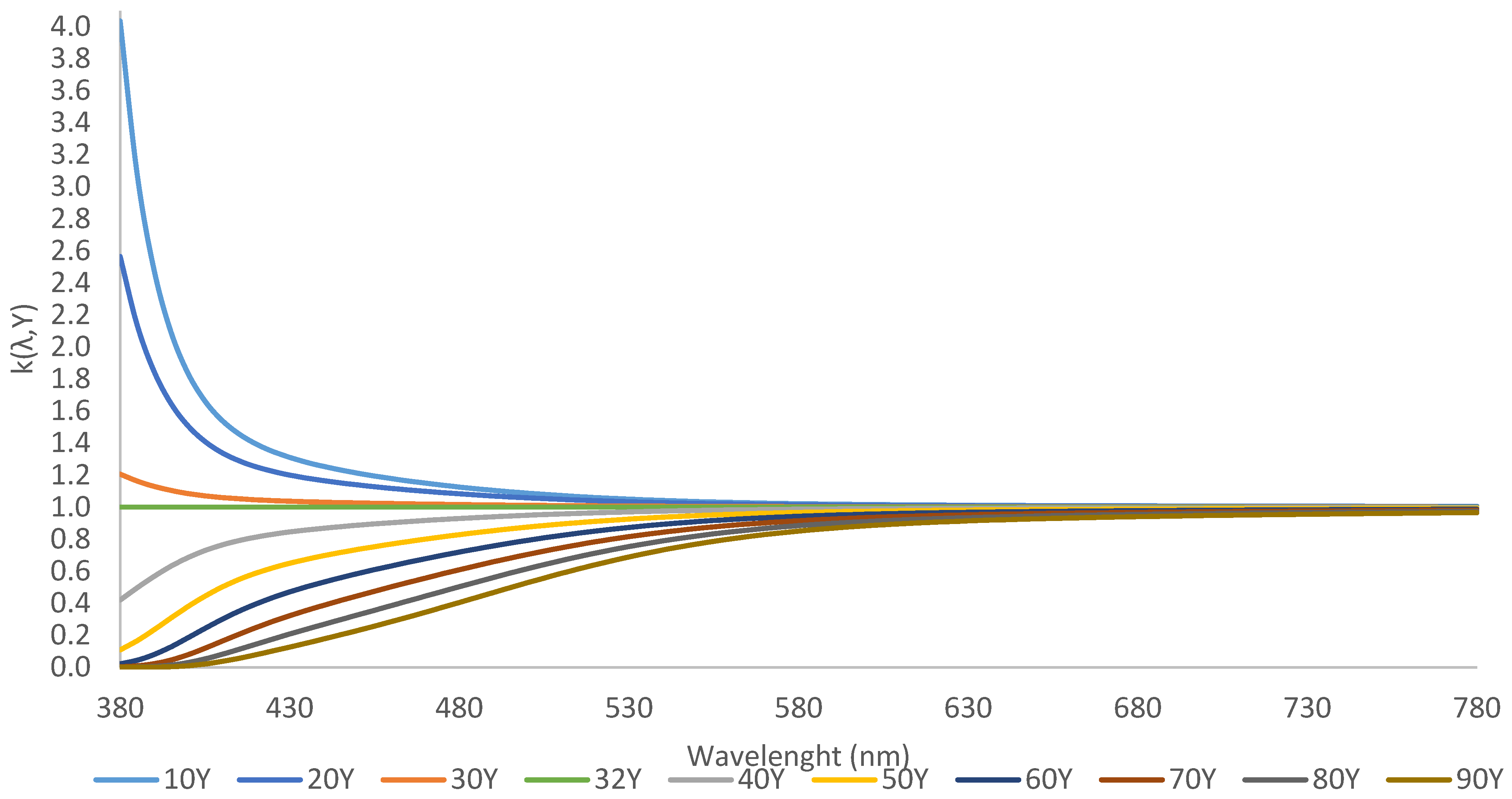 | Standard illuminant A+Lens_20Years | 2694 | 98 | 96 | 0.4648 | 0.4186 |