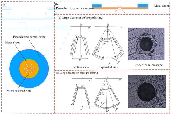 Structural drawing of the atomization sheet: (a) Vertical view; (b) Side view; (c) Large end of a micro-tapered hole before polishing; (d) Large end of a micro-tapered hole after polishing.