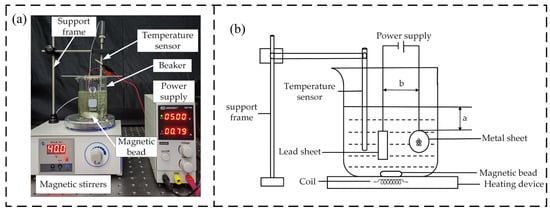 The uneven burr on the surface of the micro-tapered hole of the metal sheet was removed by electrochemistry electrolysis. The metal sheet was polished in a beaker equipped with electrolyte under the condition of a DC power supply. The power supply was a LW-K3010D (Shenzhen, China) series adjustable DC-regulated power supply with an output voltage range between 0 and 30 V and an output current between 0 and 10 A. The metal sheet was the anode, and the lead sheet was the cathode. Figure 2 shows the electrolytic polishing experiment diagram. An 85-2 digital display constant-temperature magnetic agitator (Shanghai, China) was selected. It was composed of magnetic beads, a heating device, and a temperature sensor. The magnetic beads were used for magnetic stirring, so that the electrolyte could be fully mixed in the polishing process to prevent excessive concentration difference of the electrolyte. The heating device could adjust the electrolyte to the desired temperature. The temperature sensor was used to measure the electrolyte temperature in real time. The experimental value of a is 50 mm, which is the distance between the metal sheet and the liquid surface; b is the distance between the anode and cathode plates, and the experimental value was 40 mm. According to the above analysis, the polishing voltage was controlled at 5 V, the electrolyte temperature was 40 °C, and the distance between anode and cathode sheets was 40 mm. The polishing time range was 1–7 min, and the interval time was 1 min for the group experiment.