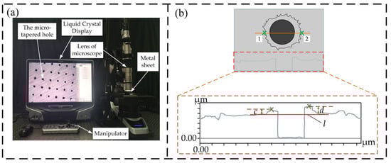 After the electropolishing experiment, to explore the influence of electropolishing treatment on the diameter of the large and small ends of micro-tapered holes and the surface quality of a laser-machined metal sheet, the holes of the metal sheet were observed using a microscope. In particular, the diameter of the large and small ends of micro-tapered holes and the height of the burr of the metal sheet were measured using an ultra-depth-of-field 3D microscope (VHX-600, Keyence, Japan) before and after electrolytic polishing.