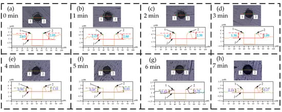 Figure 4a–h shows the burr height h of the untreated metal sheet and the treated sheets for 1–7 min. The burr height h of the untreated metal sheet is the highest, while the burr height of the metal sheet treated for 7 min is the smallest; that is, the burr height h of the metal sheet decreases as the electrolytic polishing time increases.