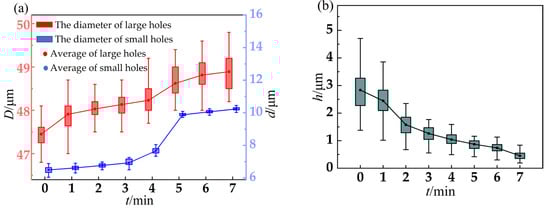 In accordance with the difference in electrolytic polishing time, the experiment was divided into eight groups. The untreated metal sheets were the first group; the second to the eighth groups had a 1–7 min polishing time. When the diameter of the large end of micro-tapered holes of the metal sheet was measured, the diameter of 100 holes was measured for each group of metal sheets, corresponding to 800 values. Similarly, when the diameter of the small end of micro-tapered holes in the groups of metal sheets was measured, a total of 800 diameter values were determined.