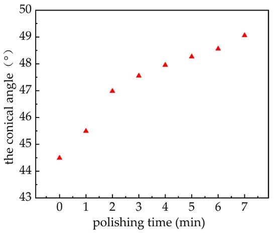 According to Equation (9) and the measured data in the experiment, the relation between the conical angle of a micro-tapered hole and polishing time and image can be obtained.